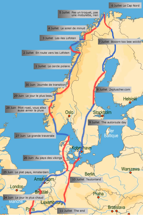 Certainement ma plus fabuleuse expérience à moto….Prenez une moto, une bonne envie de voyager, un petit peu de courage et de forme physique, 9000 km d’asphalte….Vous obtiendrez trois semaines inoubliables à traverser l’Europe de Paris à son extrême nord, au milieu de lacs, fjords, montagnes enneigées, steppes arctiques arides, accompagné de rennes, hells angels scandinaves, et beaucoup d’autres rencontres innatendues.