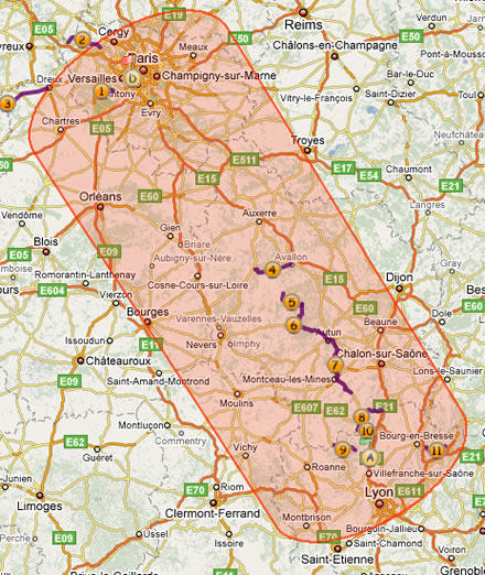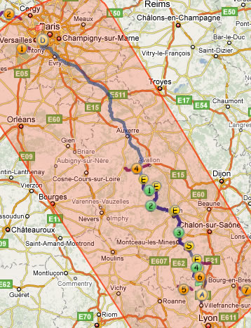 The south part of the trip is OK, but, before you reach road N°1, you would like to go a bit more western, for example having a step in Montargis. Insert a step before road N°1 by clicking on