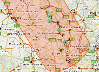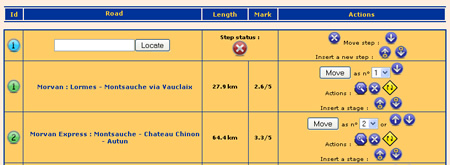 The roads in the table are now only ‘suggested’. you will have to add them to the roadbook. Go to the line of Morvan : Lormes – Montsauche via Vauclaix and click on ‘Add‘ button. Do the same with The heart of south Burgundy, Morvanexpress : Montsauche – Chateau Chinon – Autun et Outskirts of Macon. Roads icons turn to green on the map